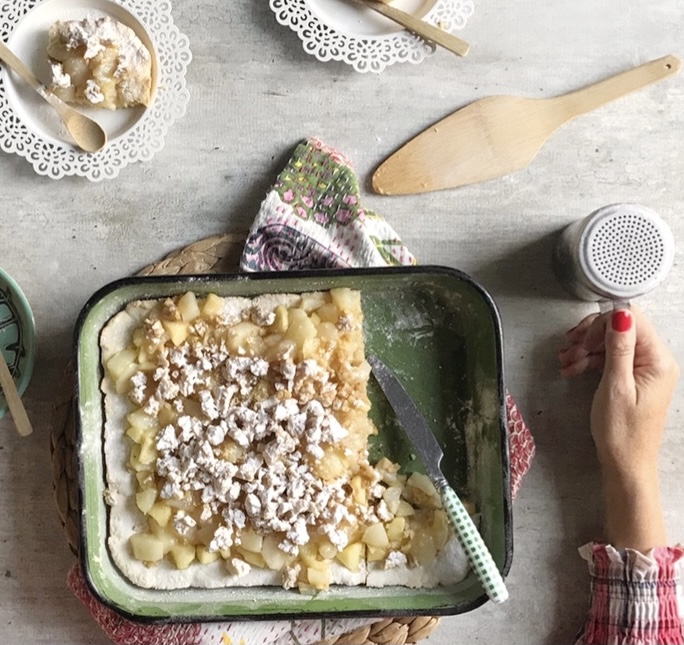 Para el RELLENO: pelar las manzanas, cortarlas en cubitos y retirar las semillas. Colocar en una cacerola junto con la manteca y el azúcar. Cocinar a fuego moderado hasta que las manzanas estén tiernas. Dejar enfriar. Colocar el relleno sobre la masa ya cocida.